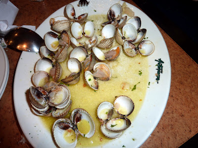 We ordered two raciones: gambas al ajillo (shrimp with garlic) with piquillo peppers, and berberechos with garlic and parsley. Berberechos are smallish clams with pretty crinkled white and brown shells. The gambas were very tasty, fresh, full of garlic and made with quality olive oil, with pieces of piquillo peppers on the edges of the plate as decoration. We dipped into the sauce with pieces of big country bread they gave us, so there was nothing left at all on the plate. We were too hungry to take the time to photograph the plate. The second dish, the little clams, were even better: each of them meaty and tasting of garlic and the sea. We took a picture of that one.